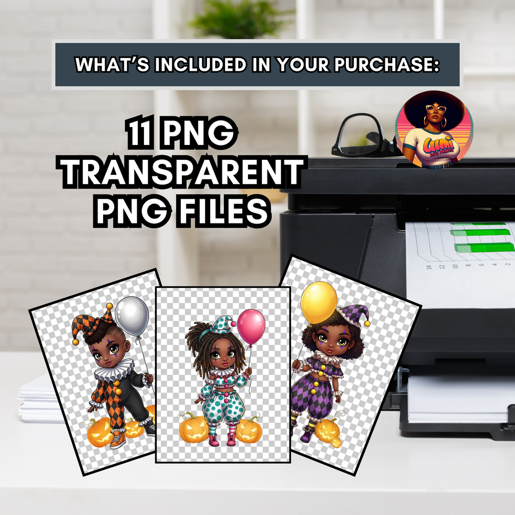 Ready to take your Halloween crafts, party invites, and spooky season content to the next level? The Halloween Chibi Clown Clipart Bundle – Set 2 is bursting with adorable attitude and creative charm. Featuring 11 high-resolution PNGs of Black girl chibi clowns in playful costumes, colorful balloons, and pumpkin accents — this collection is perfect for crafters, digital designers, and Halloween lovers alike!