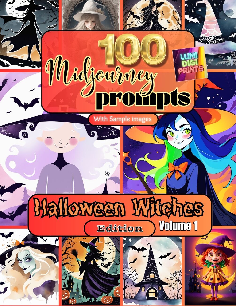 pdf file of 100 Midjourney Halloween Witches Prompts and 100 Sample pics to use to with the blend feature.